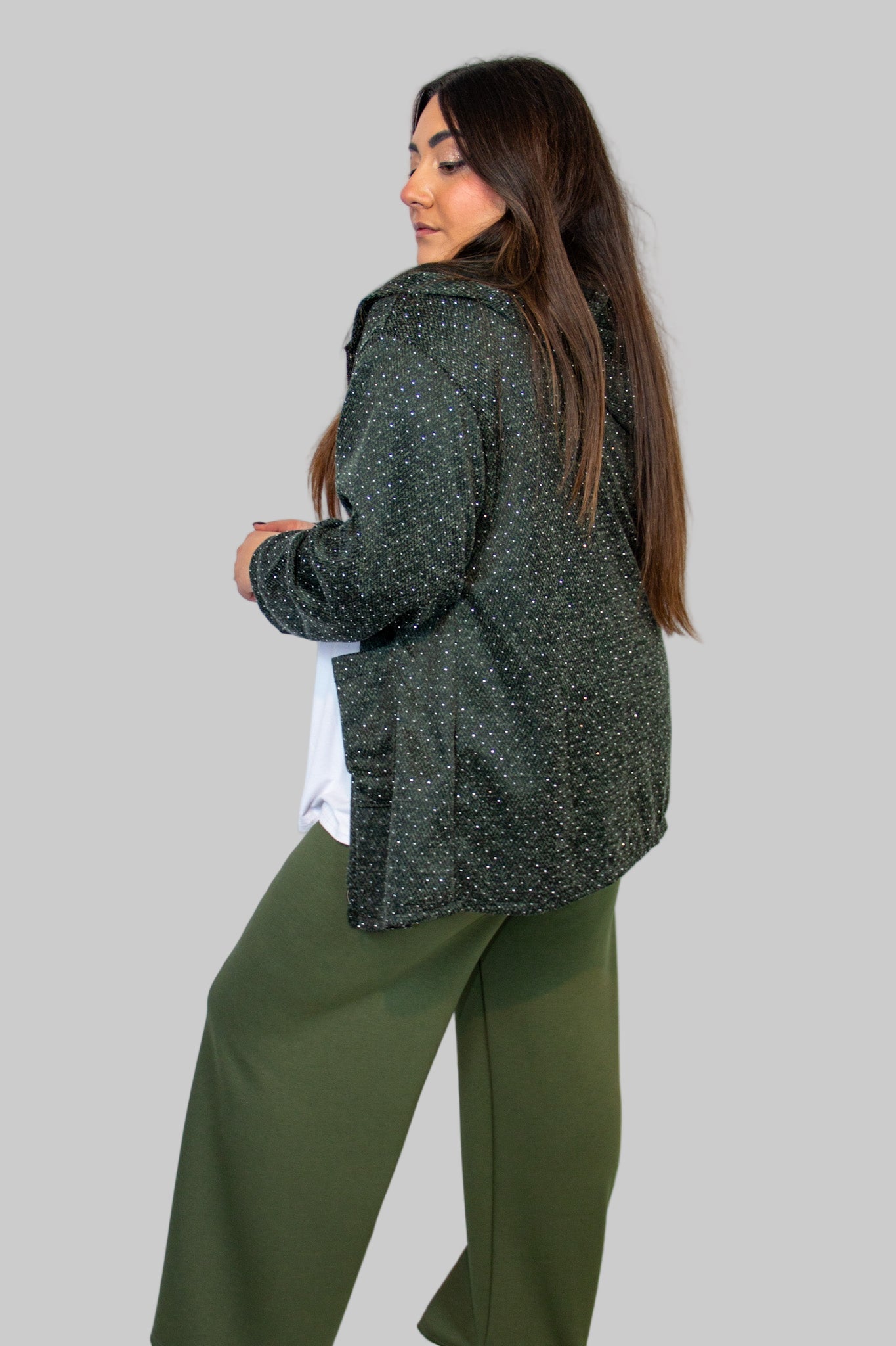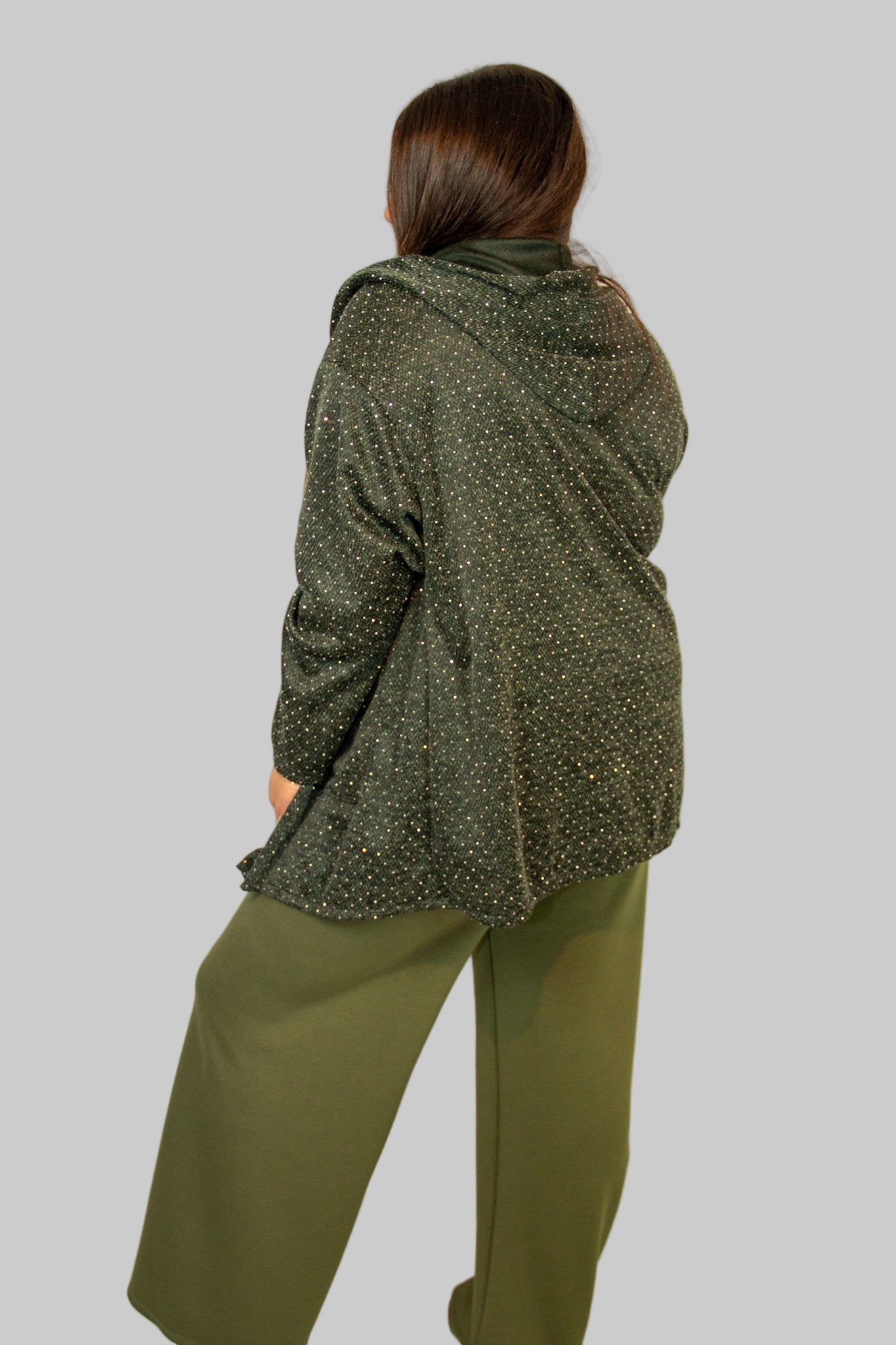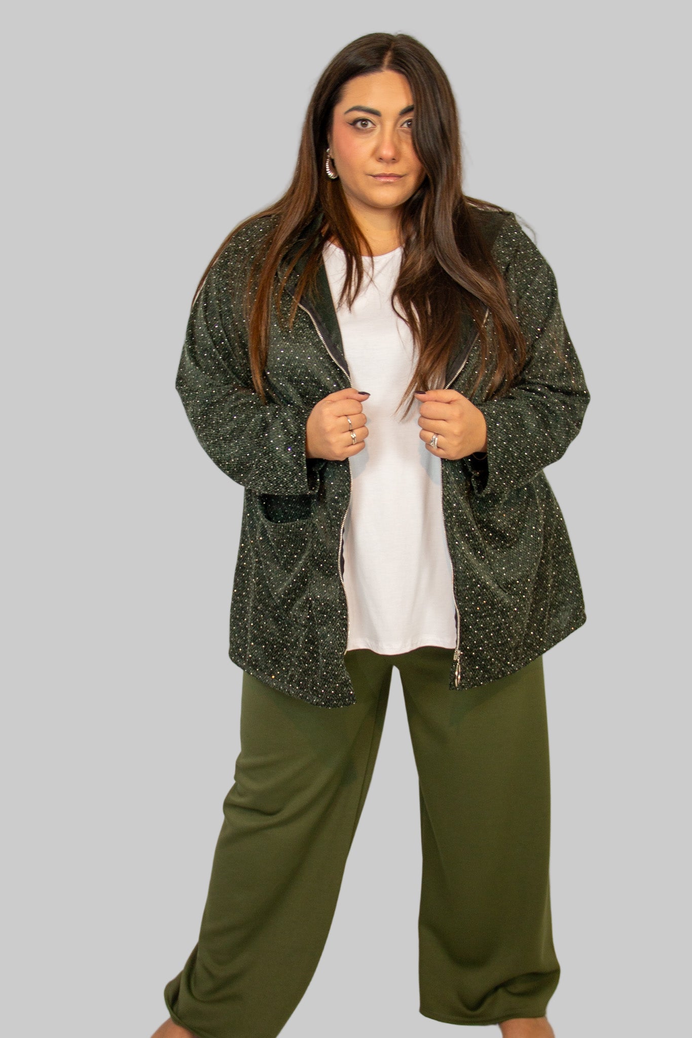 La giacca Isabella è il capo perfetto per chi cerca praticità e raffinatezza in un unico outfit curvy. Il cappuccio dona un tocco casual e funzionale, mentre le applicazioni di strass aggiungono luminosità senza esagerare. Dotata di chiusura con zip frontale e tasche dritte sovrapposte, questa giacca curvy veste dalla taglia 48 alla 56, studiata appositamente per valorizzare le forme.