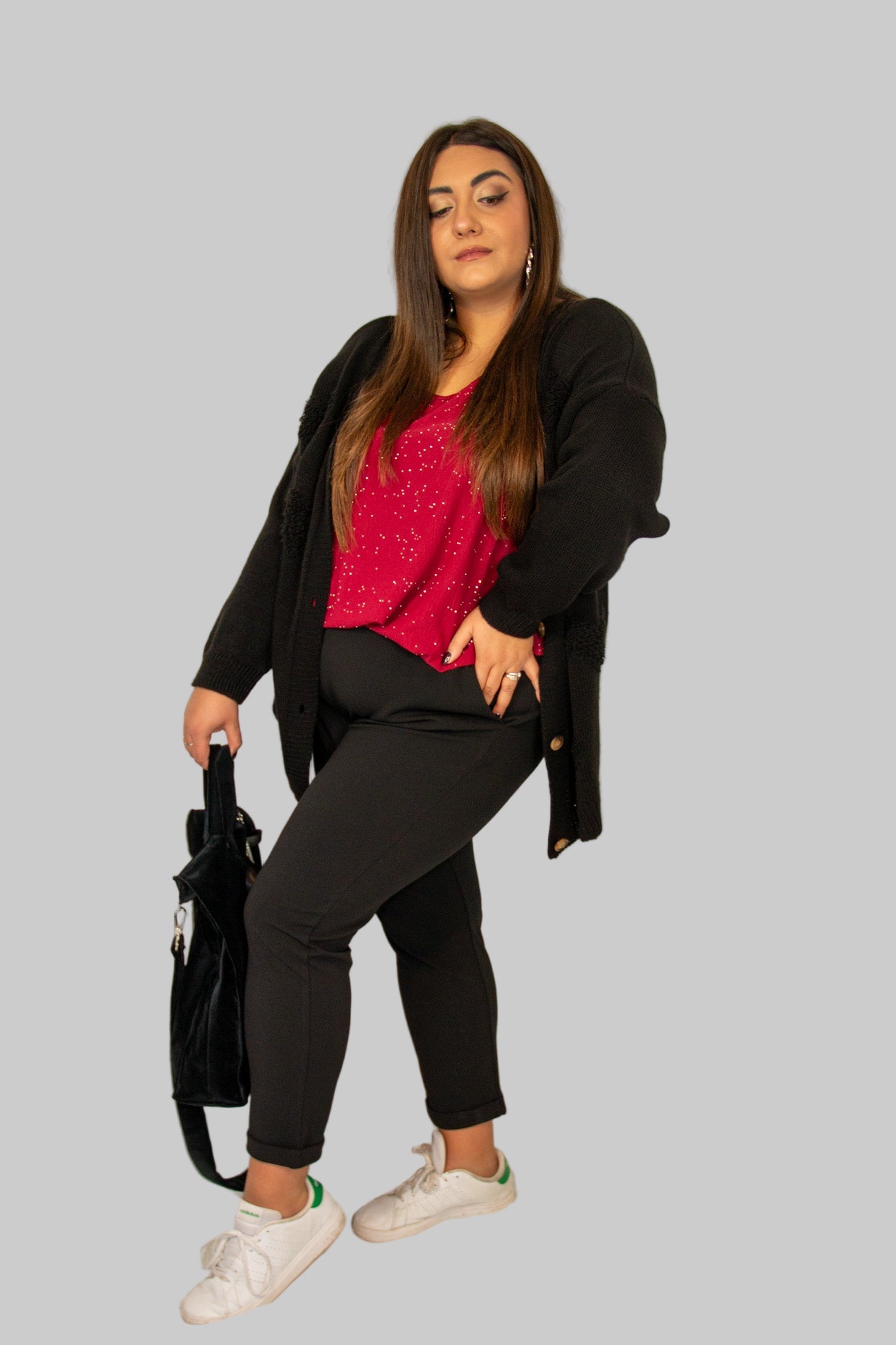 La giacca maglione Amour, arricchita da cuori tono su tono e bottoni frontali, è un capo romantico e originale che unisce la comodità di un cardigan alla raffinatezza dei dettagli. I cuoricini tono su tono conferiscono un tocco femminile e delicato, mentre i bottoni frontali consentono di indossarla aperta o chiusa, adattandola facilmente a outfit curvy casual o più ricercati. Perfetta per la moda curvy e le taglie forti, questa giacca valorizza ogni silhouette con stile e dolcezza. La modella è alta 1,72 m.